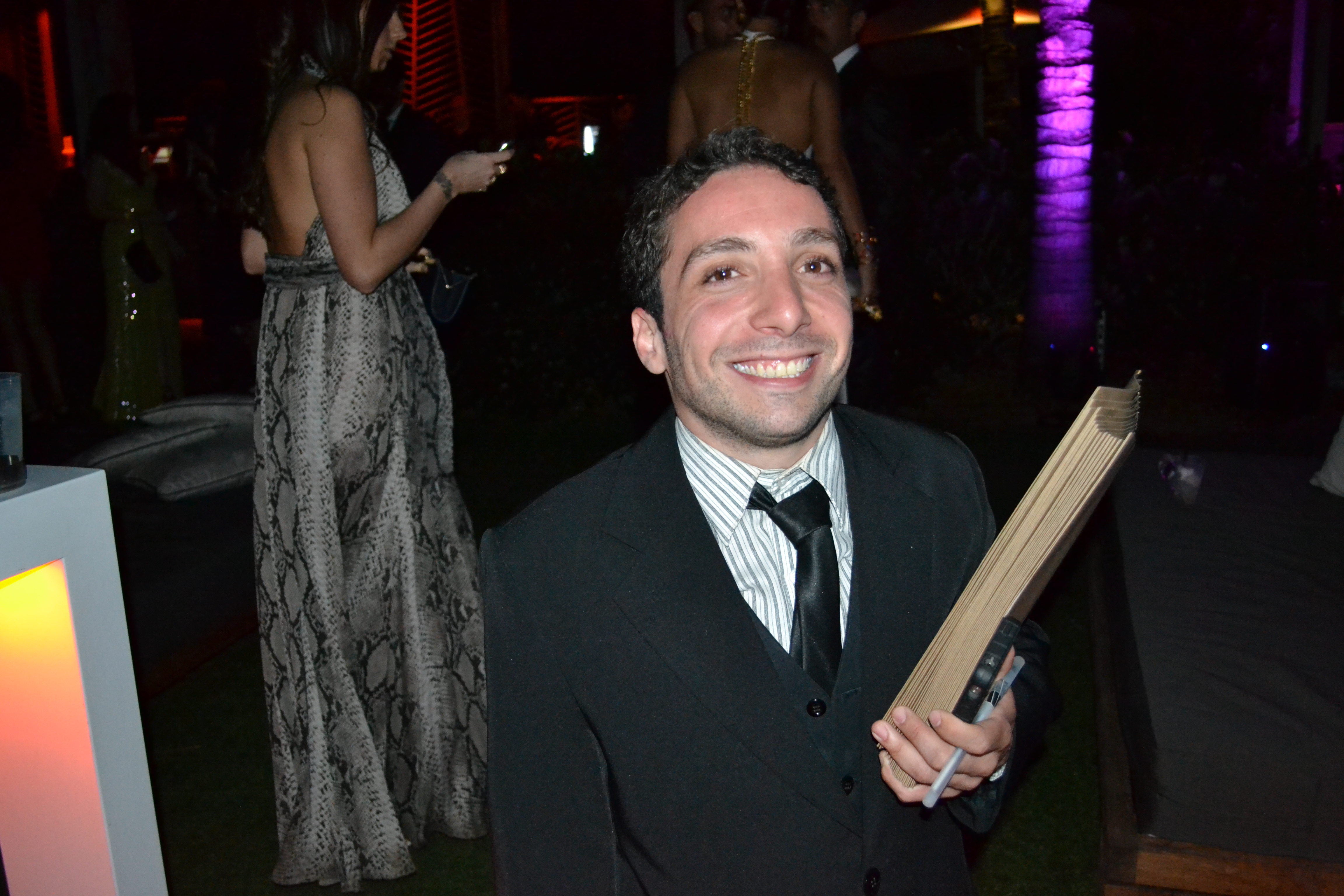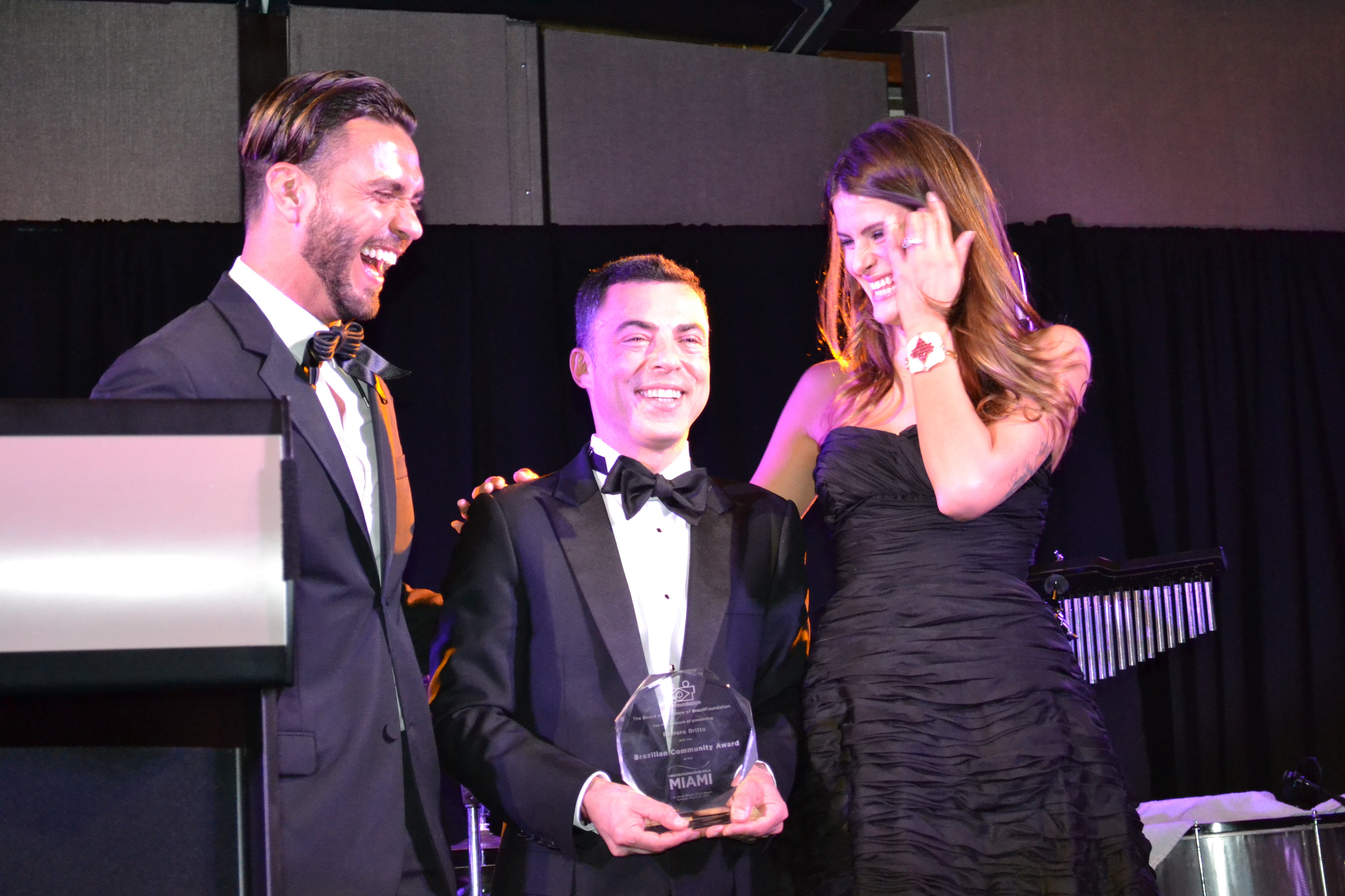 Marcus Vinicius Ribeiro, do conselho de diretores e um dos membros fundadores da BrazilFoundation, recebe prêmio em nome do artista Romero Britto que não pode comparecer. Britto doou um capacete que leiloou por US$20 mil