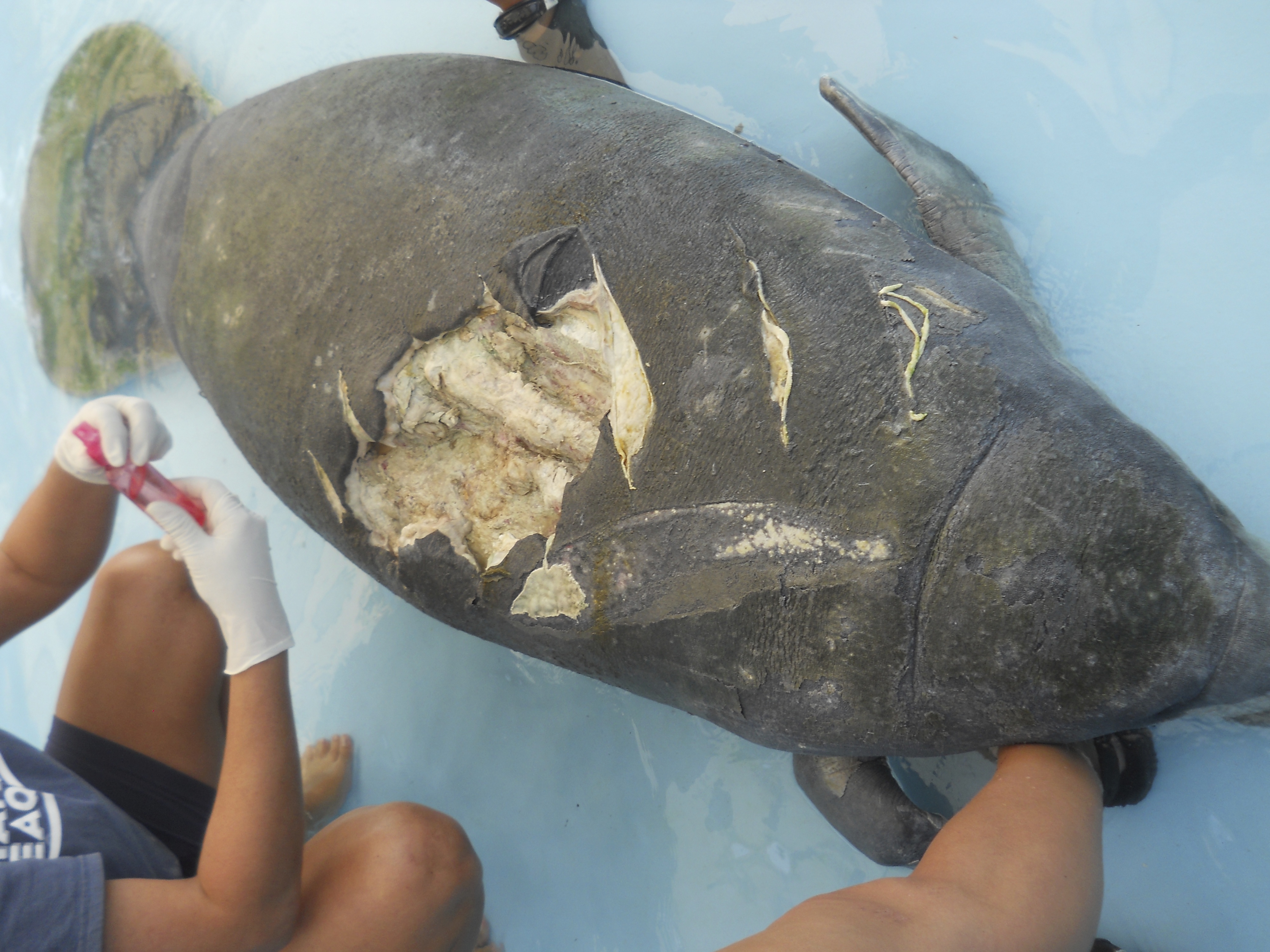 “Quando chegou, Wiley tinha sido ferido por um barco. Dava para ver suas vértebras”, conta Tuzinski. “Estava bem fraco, com infecção, letárgico. Por sorte não ficou paralítico”.