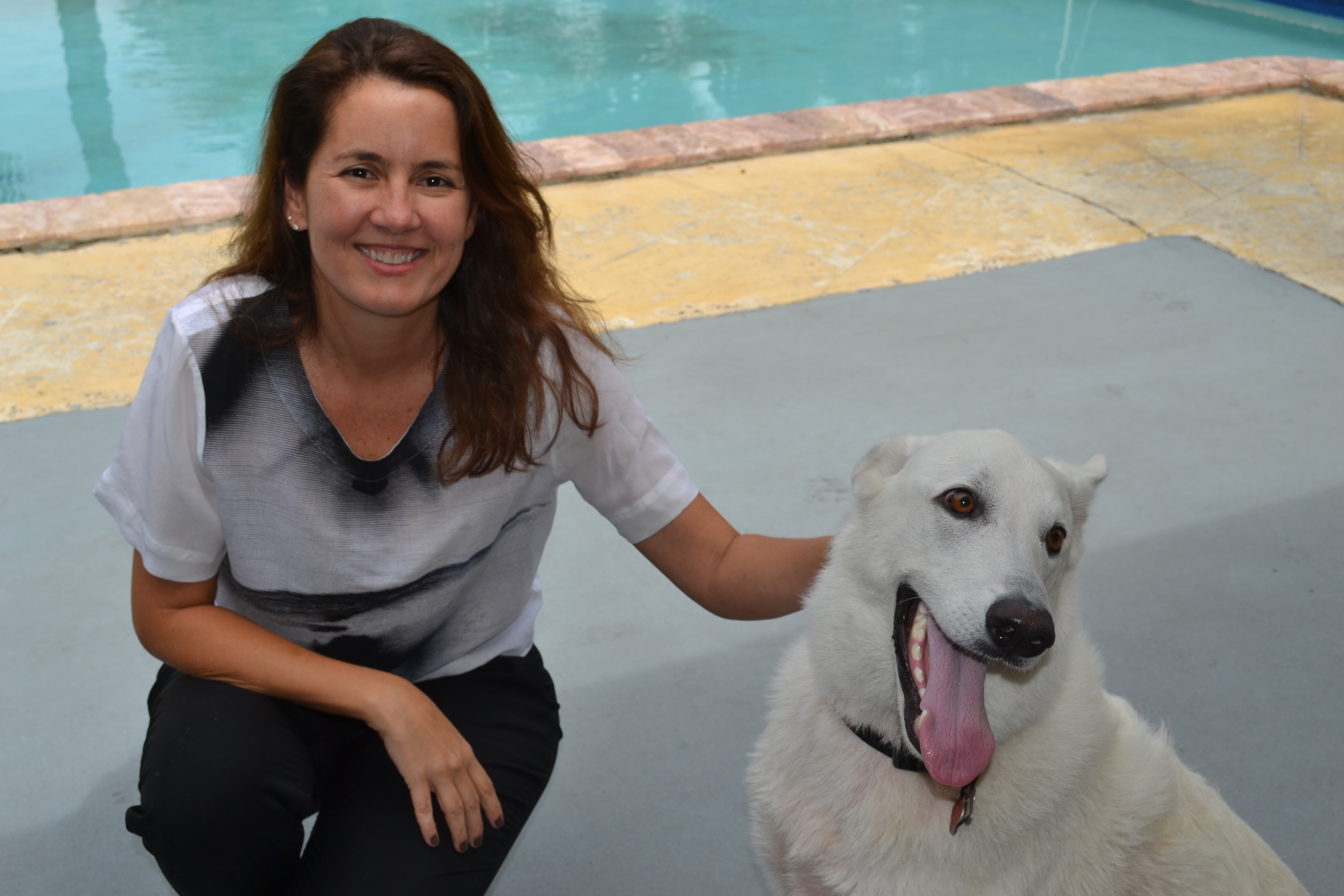 Viviane na piscina de sua casa com Athena Von Claude, uma cadela da raça Pastor Alemão – capa branca, com um ano e meio e 50 kg. Foto de Carla Guarilha