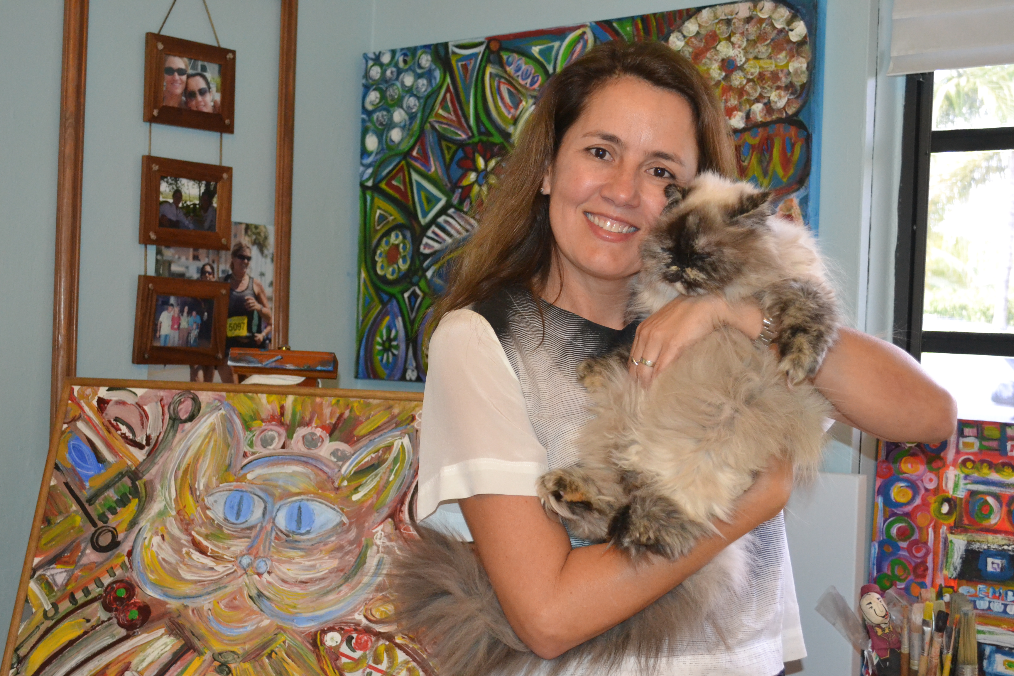 Viviane com Samantha Jones, sua gata, ao lado de um de seus quadros. Ela tem um pequeno atelier em casa e ainda sonha em abrir uma galeria de arte em Miami. Foto de Carla Guarilha