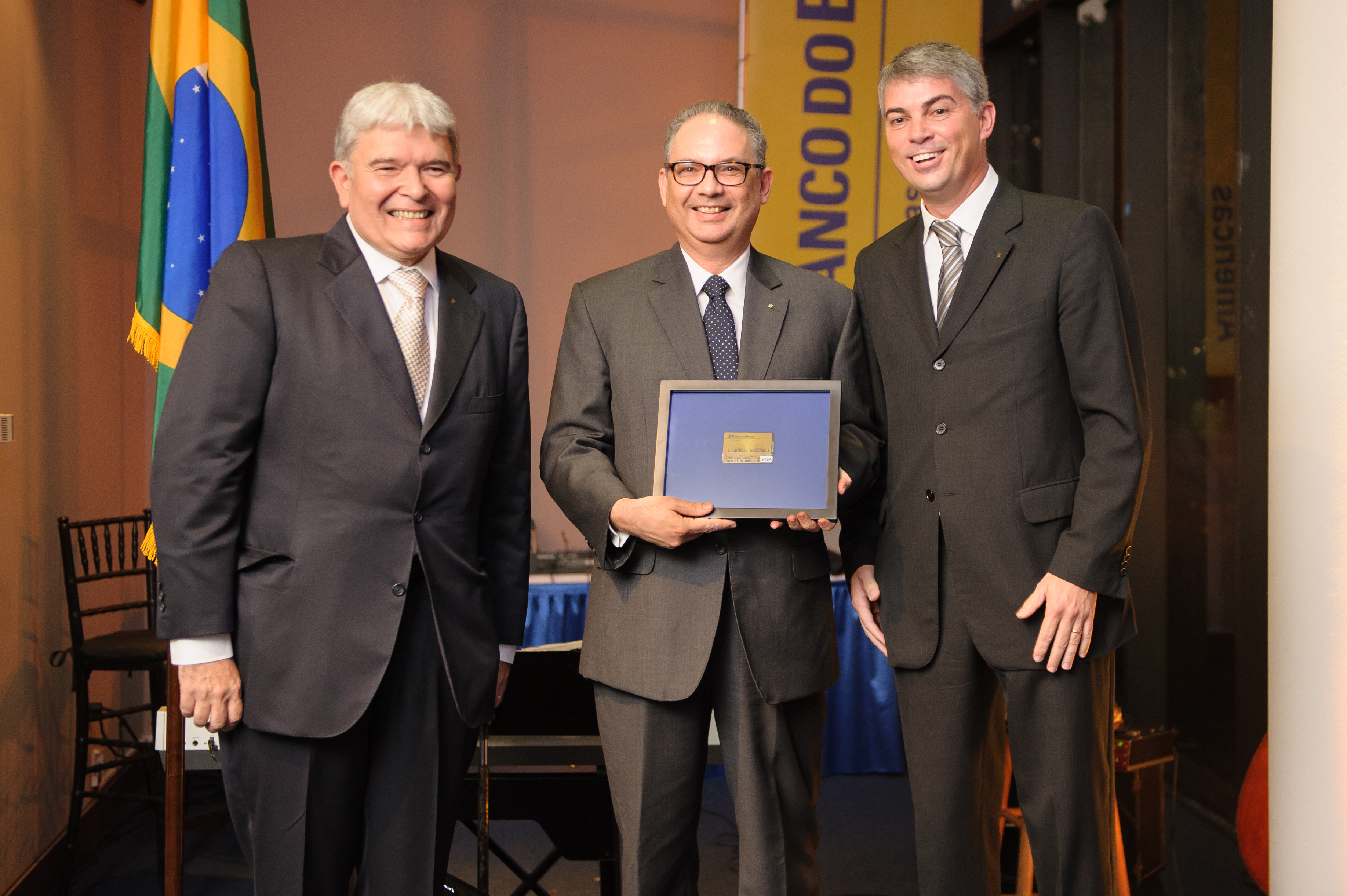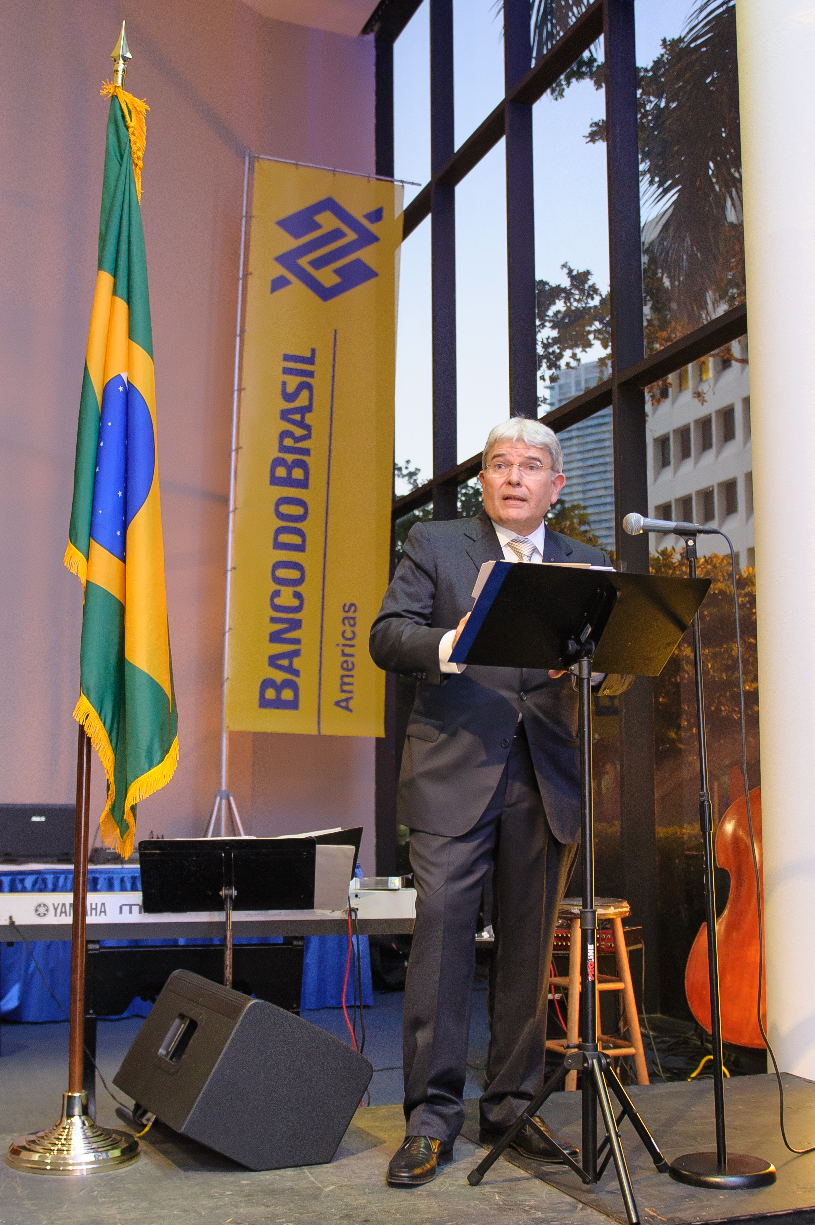 Leandro Martins Alves entrega simbolicamente o primeiro cartão de débito “0000000001” do Banco do Brasil Américas para o Embaixador Hélio Vitor Ramos Filho, Cônsul-geral do Brasil em Miami. Ao lado, Jefferson Hammes, vice presidente do Banco do Brasil Américas. Foto: Fabiano Silva