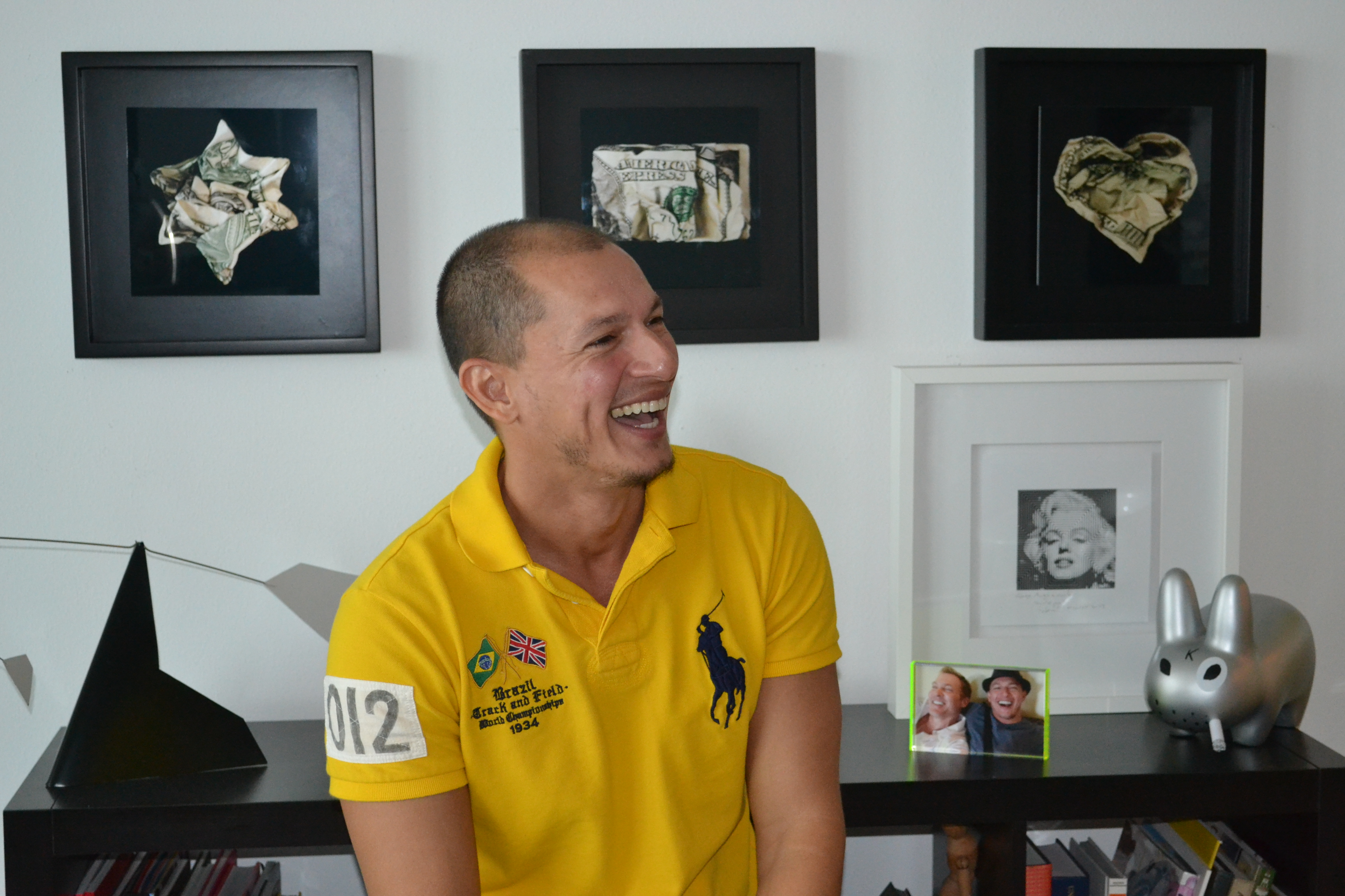 Na sala de seu apartamento em South Beach. Na parede, parte da série “Show me the Money”. Foto de Carla Guarilha