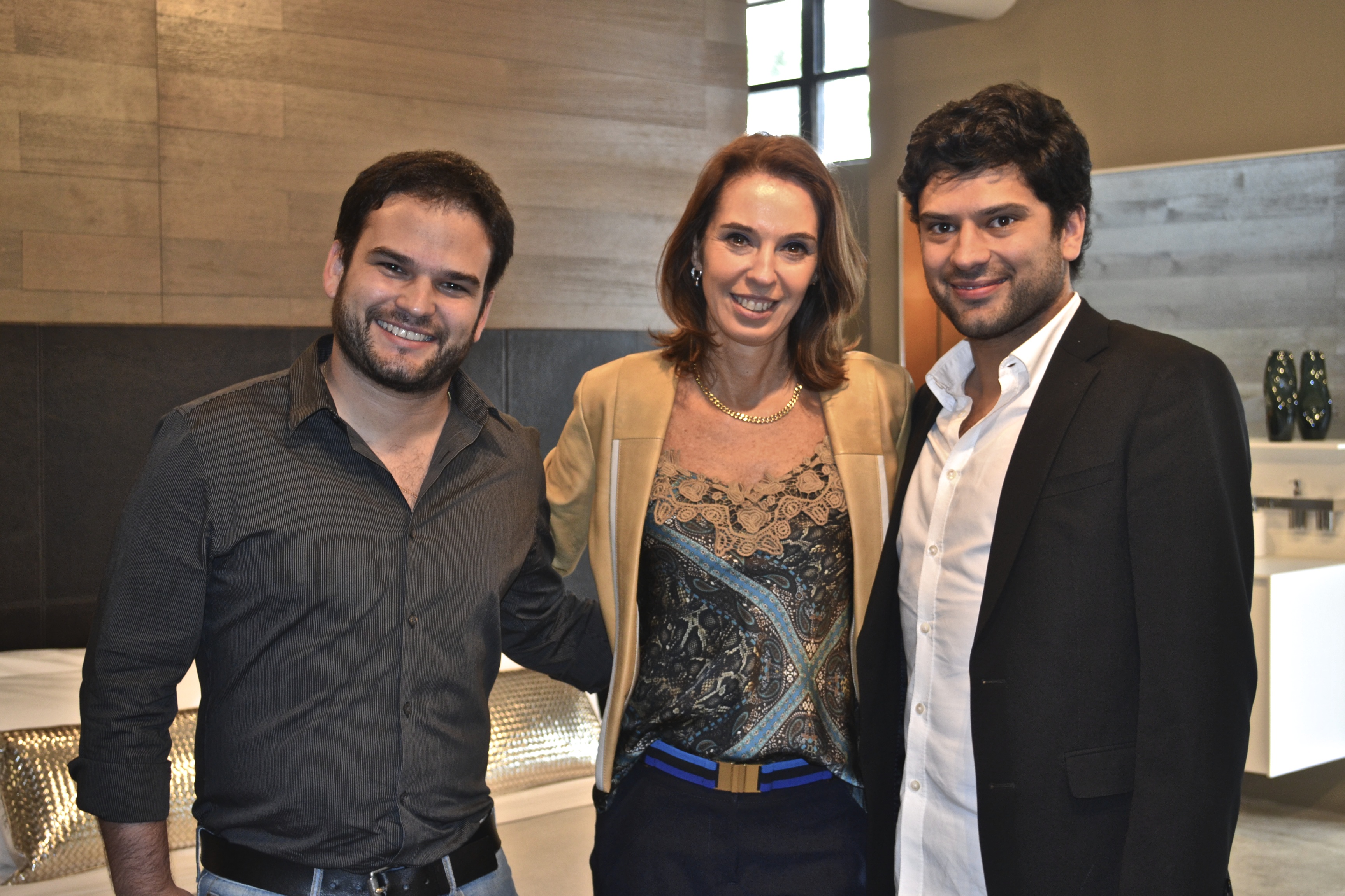 Esther Schattan, entre os irmãos Claudio (dir.), e Olavo Faria (esq.), donos das franquias de Miami e Dallas. Foto de Carla Guarilha