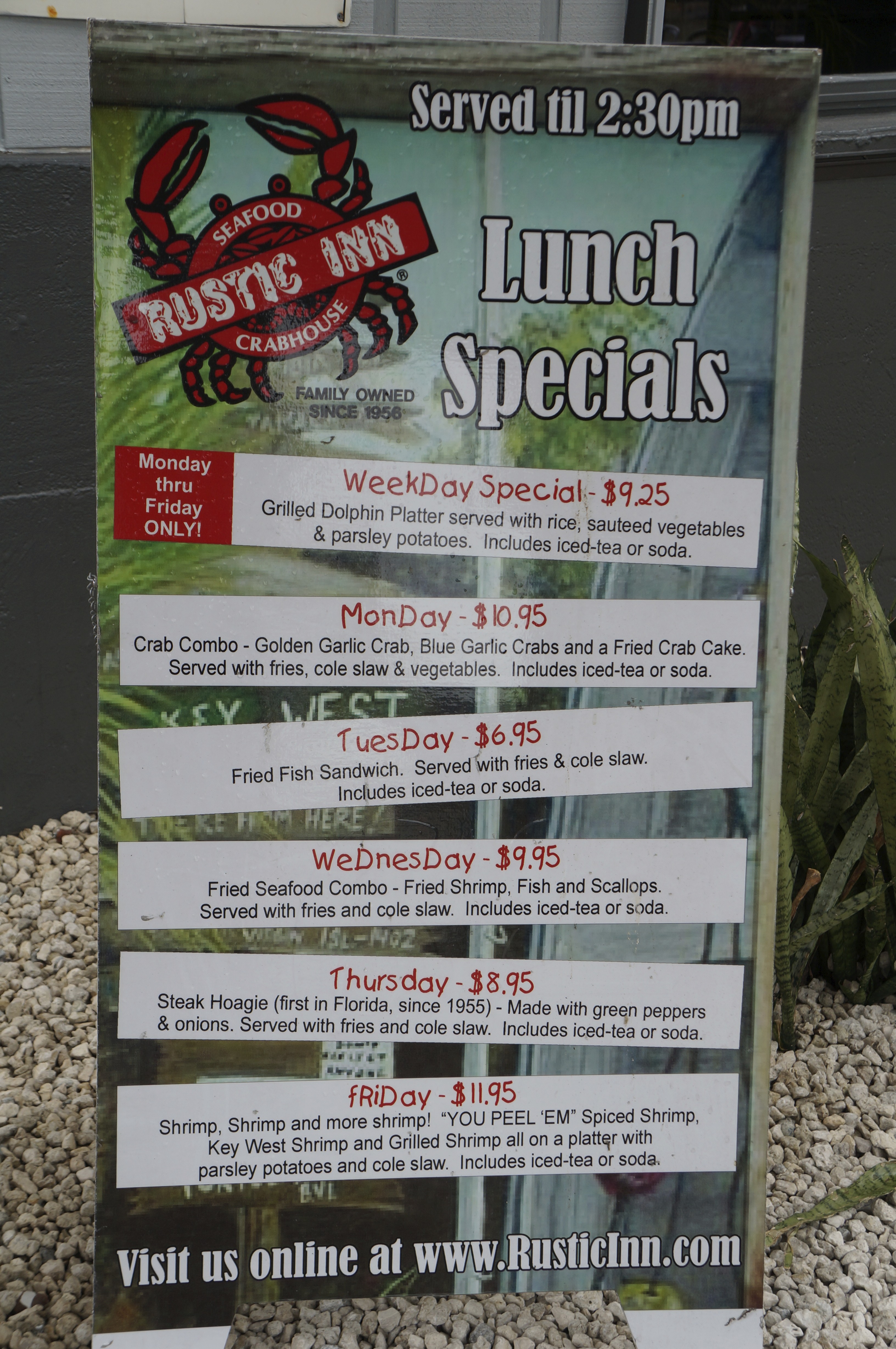As contrário do Joe’s, que exige manga comprida para os homens e não permite trajes de praia ou shorts, o Rustic Inn, aberto em 1955 à beira de um canal, mantém uma atmosfera informal e simples.