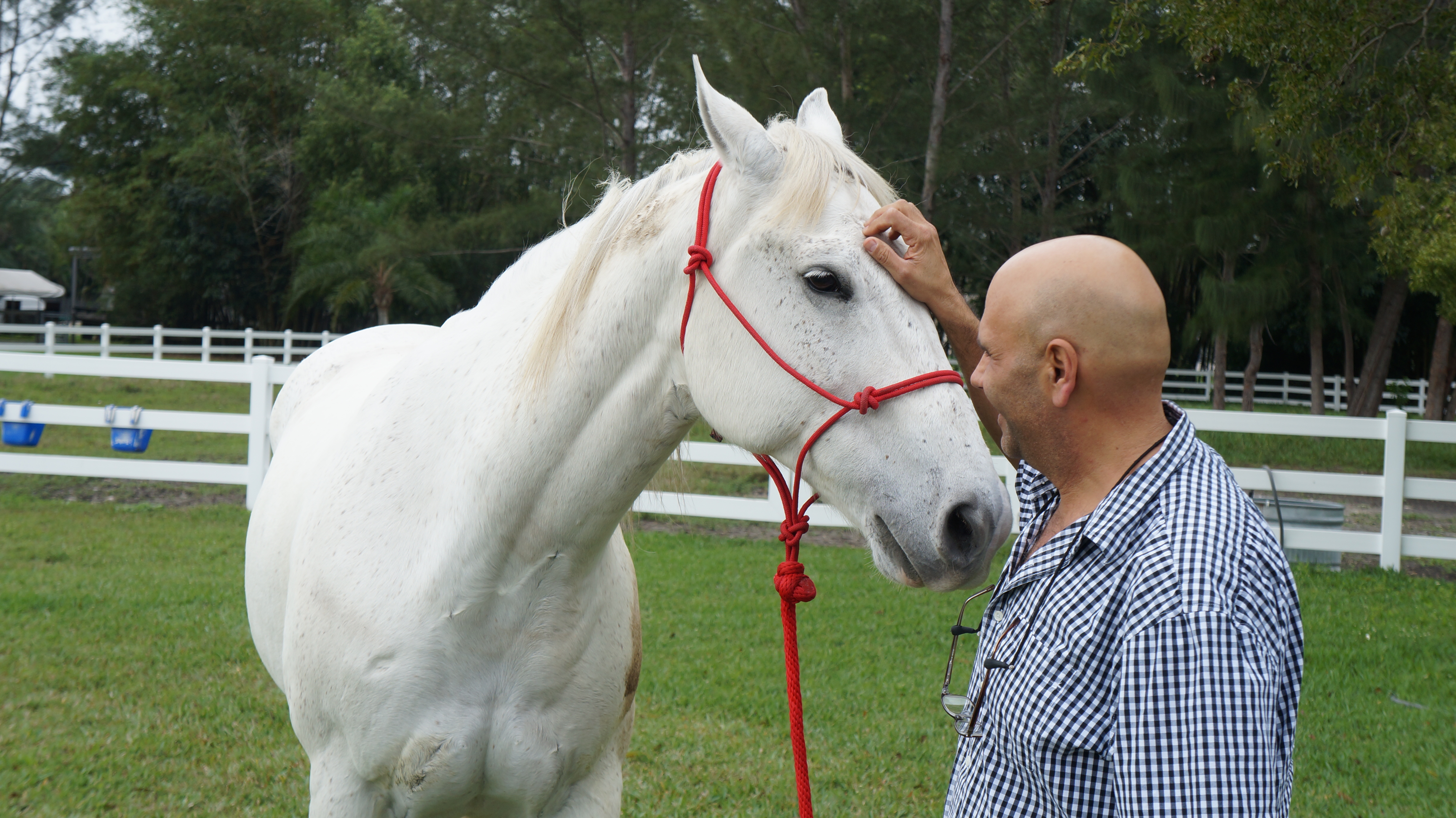 Antônio Pedro em sua casa, um rancho em Weston, próximo de Miami, com Blue, de 11 anos, seu companheiro e campeão em rodeios. Foto: Chris Delboni.