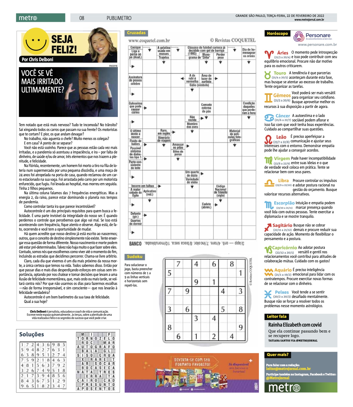 irritadas, e a pandemia só acentuou a impaciência, e ira – por falta de dinheiro, de saúde e/ou de amor, três elementos que nos trazem a ple- nitude, e felicidade.